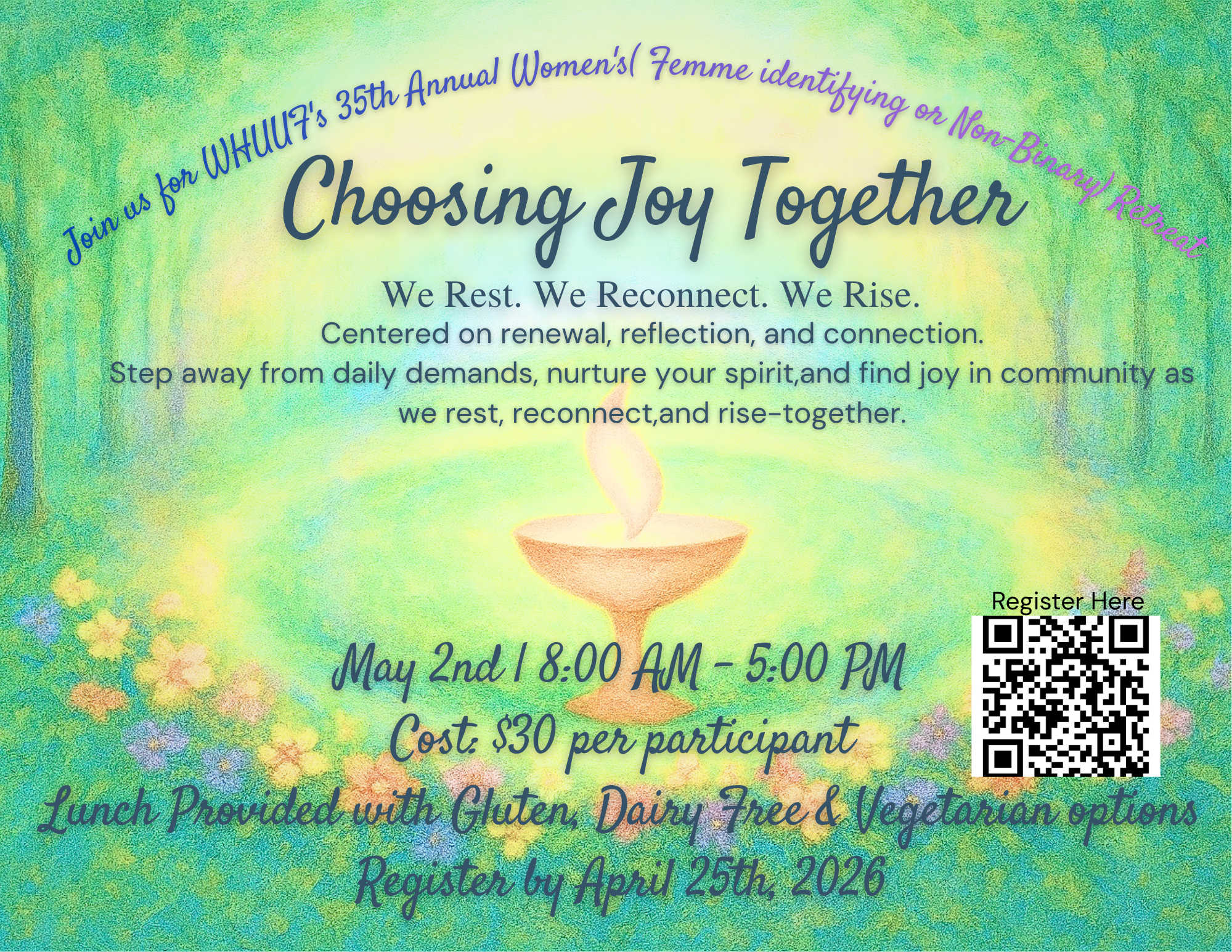 Join us for a one-day celebration of connection, creativity, and joy! This year we’re keeping it local and inclusive—no overnight stay, just a full day of laughter, learning, and community in our beautiful WHUUF space (including the wooded grounds!).