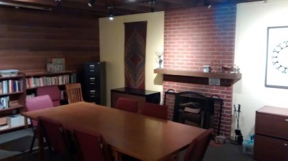 Conference style room with comfortable seating for up to 10. Tech available to conduct hybrid meetings, whiteboard. No air conditioning.