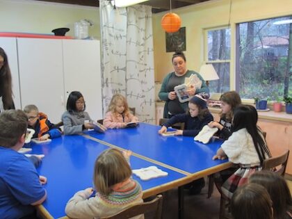 Classroom and craft space. Can hold up to fifteen children. Adult size chairs can also be used in the room, which can then comfortably handle up to 12 adults.